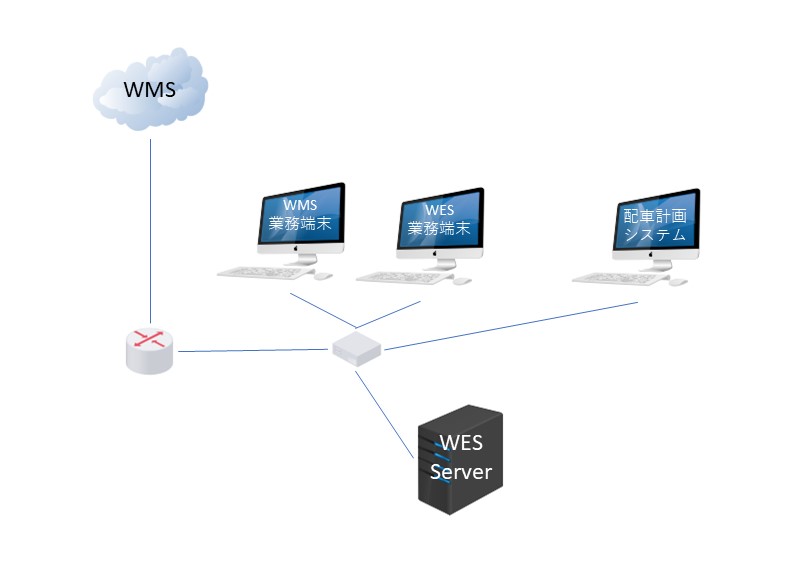 WES/マテハン機器系ネットワークは、バッチ単位のファイル転送および、マテハン機器間でのデータ通信が頻繁に、かつ高速(ミリ秒単位)で行われます。WESサーバーは、ゲートウェイとしての役割を兼ね備えて、拠点内の2系統のネットワークを分離します。