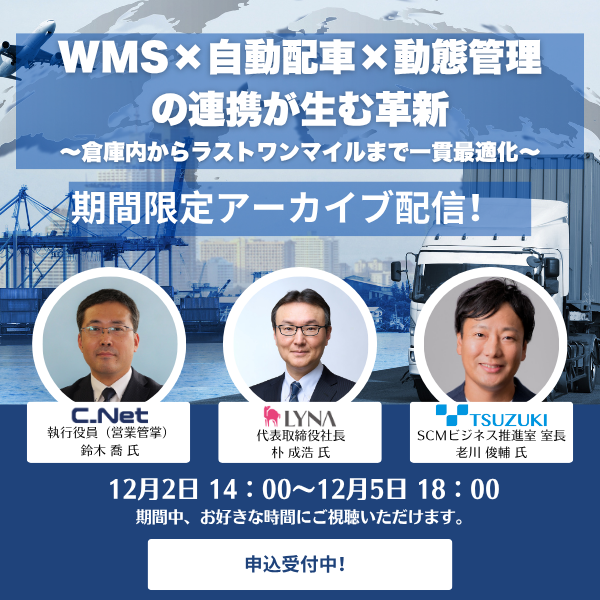 WMS(シーネット)×配車システム(ライナロジクス)×動態管理(都築電気)の3社連携よる新たな連携構想とその狙いについてご紹介します。