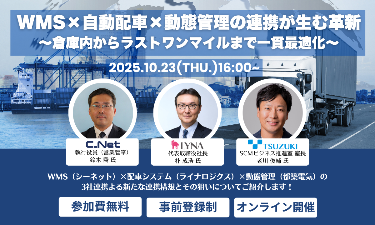 シーネット、ライナロジクス、都築電気の3社共催セミナー「WMS×自動配車×動態管理の連携が生む革新」 ~倉庫内からラストワンマイルまで一貫最適化 10月23日(木)にオンラインで開催~